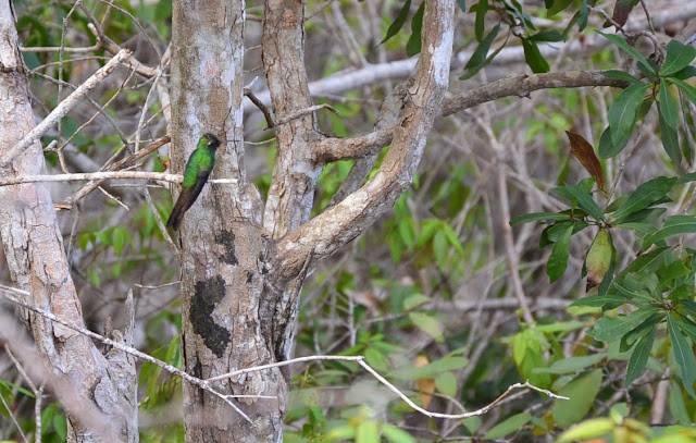 Cuban Emerald Hummingbird (Chlorostilbon ricordii): this small hummingbird is 4" long (10 cm). We saw it during a hike along the ridge of a steep hill behind our resort. It was about four feet off the ground, in good camouflage - a small, vibrantly-green shrub. I was lucky to get a fairly good picture of this species - they don't stick around for long, and they beat their wings at a very rapid pace. If they perch for a moment nearby, you are fortunate indeed. This bird is almost entirely emerald green, but is has a blue iridescence that is occasionally seen on its chest, if the light is shining on it at the correct angle. It has a relatively long, black tail that is forked. The Cuban Emerald is found in forests, coastal vegetation, and gardens. It feeds on nectar, spiders and insects.